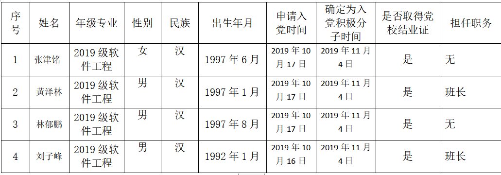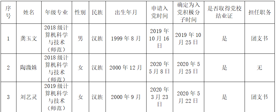 经av在线 计算机科学与技术(师范)一党支部培养考察,在听取党小组、培养联系人、党员和群众意见的基础上,经党支部(或支委会)讨论,确定龚玉文等3同志为发展对象。现根据学校发展对象备案制度进行公示,公示期为202...