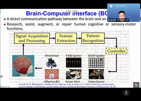 伍教授介绍了什么是脑机接口、脑机接口的分类、学术贡献和应用前景等,聚焦脑机接口的精准、安全和隐私保护三个研究目标,阐述了无创脑机接口还存在解码不精准、安全待探究、隐私易泄露等问题挑战。先进的机器学习方法可以帮助减少甚至完全消除校准,提高系统准确度和用户友好性,展示了脑机接口中机器学习的最新进展和研究挑战。