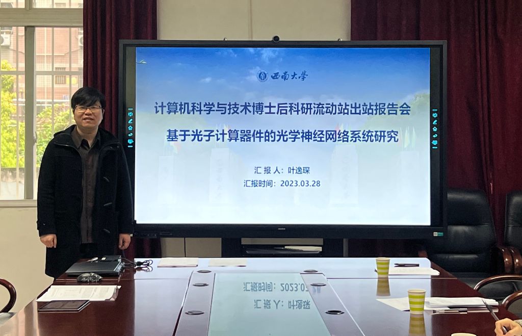 叶逸琛做出站工作汇报,以《基于光子计算器件的光学神经网络系统研究》为题,从研究背景与意义、研究内容与完成情况、总结与展望等方面介绍了在站期间的主要工作情况。并汇报了其研究成果,以第一作者及通讯作者在相关领域发表SCI期刊论文2篇;作为项目负责人获批重庆市博士后研究项目特别资助1项;参与国防科技创新特区项目1项,重大专项项目1项。