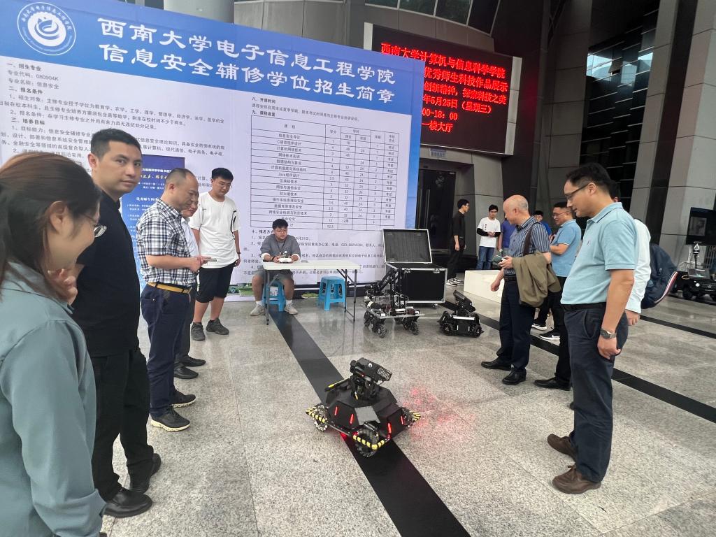 本次活动共有5个师生团队参与,带来了多传联动场景理解、八轮足机器人、环振机器人、基于物联网的校园环境监测系统、智能门锁系统、智能手环、步兵机器人、工程机器人、飞镖发射装置、战斧战甲等十项科技成果,共吸引了几百名师生参观、咨询、体验和实际操作。