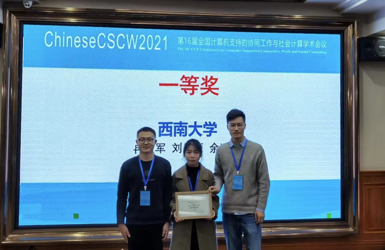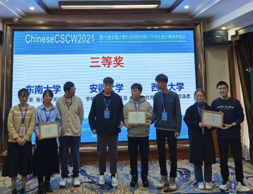近日,在湖南湘潭举办由中国计算机协会(CCF)协同计算专委会组织的第十六届ChineseCSCW2021恒电杯大数据竞赛上,我院研究生组建的两支参赛队伍分获全国一等奖和三等奖的佳绩。