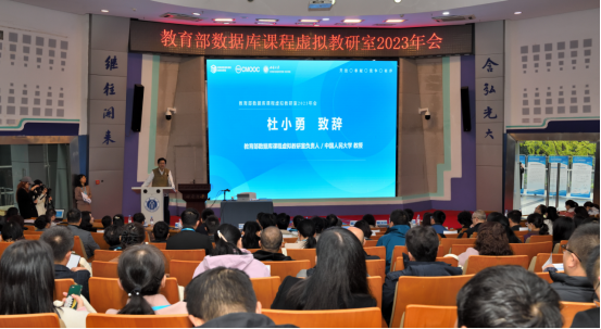 院长肖国强教授现场致辞。杜小勇教授对与会来宾表示诚挚的欢迎和衷心的感谢。他表示建设虚拟教研室是响应教育部新时代教育改革需求的重要举措,旨在通过资源共享与合作研究推动数据库教学的全面进步。他希望通过本次年会,能够促进数据库领域专家学者之间的经验交流,共享课程建设的丰富资源。