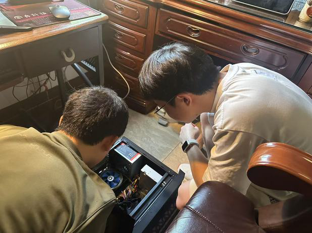 图4-5:团支部学生代表正帮助刘勤晋老师维修电脑