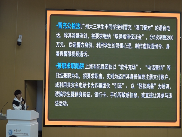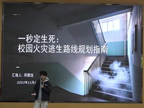 随着主持人刘屹民同学的开场,比赛正式拉开帷幕。本次比赛从全院30余份参赛作品中选出6位选手进入决赛,参赛选手围绕“校园安全”主题依次进行“校园安全创意班级活动规划”可行性分析、“校园安全知识”宣讲。在活动规划环节,参赛选手聚焦反诈防骗、实验室安全、校园火灾逃生等高校安全关键领域深挖活动开展的可能性,通过多样化的互动增强参与感。在安全宣讲环节,参赛选手创新采用游戏式对话、AI赋能演示等形式,结合真实案例素材,深入拆解安全风险点,细致讲解防范方法与应急逃生技巧,将专业安全知识与校园生活场景深度融合,为现场观众呈现了一场兼具知识性与趣味性的安全盛宴。