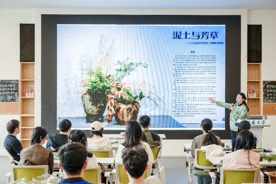 活动伊始,苏苏老师为同学们带来了系统的中式插花理论分享,从秦汉时期的萌芽、唐宋的兴盛到明清的鼎盛,苏苏老师梳理了中式插花跨越千年的发展脉络,细致讲解了中式插花的技法要点、造型逻辑与核心美学理念,深入阐释了中式插花“天人合一”“虽由人作,宛自天开”的东方哲学。苏苏老师强调,中式插花从来不是简单的花草堆砌,而是创作者心境、学识与文化底蕴的综合表达,要视花为有灵有情之物,在创作中兼顾花的静态形态美与动态生命变化之趣,让传统花艺真正融入当代日常。深入浅出的讲解,让同学们对中式插花的文化内涵与美学精髓有了更深刻的认知,为后续的实操创作筑牢了基础。