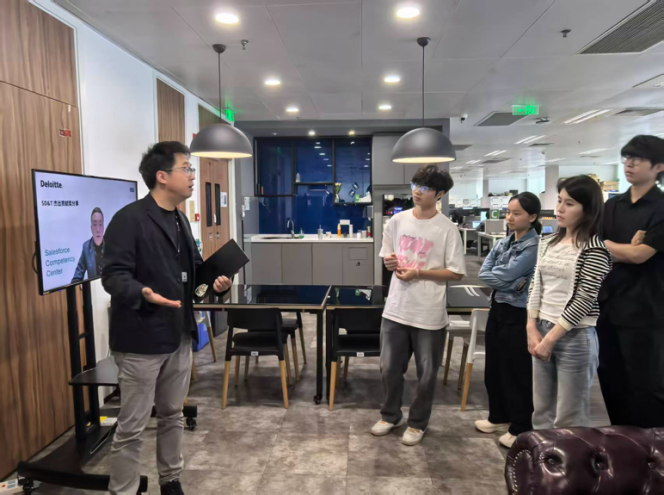 抵达德勤咨询公司大楼后,同学们首先参与了企业宣讲会。宣讲会由校园招聘经理孙业鹏主持,德勤中国咨询全球交付中心领导合伙人王华、德勤中国咨询全球交付中心总监张峰华系统介绍了德勤的发展历程、核心业务、行业布局与人才培养体系,这让同学们对咨询行业、数字化服务及前沿技术应用建立了初步的全面认知。