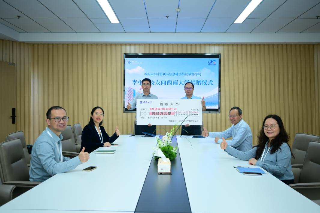 党委书记易鹏、纪委书记刘作勋、副院长李娅、副院长廖剑伟,重庆胜券科技有限公司创始人、1984级校友李小洪参加捐赠仪式。