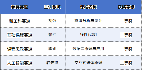 教师凭借先进的教学理念、深入的教学改革实践和出色的课程展现,在比赛中脱颖而出,获得3项一等奖和1项二等奖。