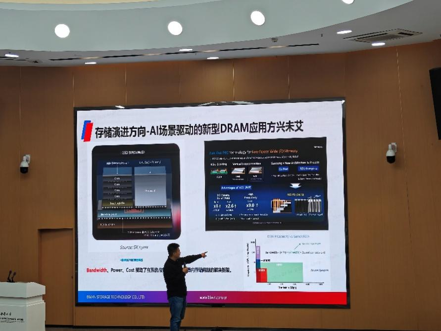 讲座伊始,高嵊昊从宏观产业视角切入,指出全球数据量指数级增长、核心芯片国产化加速及AI技术爆发,为存储市场带来前所未有的机遇。AI驱动存储需求强劲增长,推动全球存储市场在周期回调后大幅反弹;同时,未来存储计算将向“云端”与“边缘计算”两端高度集中。技术演进方面,他重点剖析DRAM与NAND闪存前沿动态:AI算力崛起使现有封装架构面临内存瓶颈挑战,催生HBM、CXL等新型应用发展;MRAM、RRAM等新介质虽不断涌现,仍无法完全替代传统高性能介质;NAND技术向更高层数、更快速度演进,对先进控制器芯片与固件算法提出更高要求。结合佰维存储产业实践,高嵊昊阐释“研发封测一体化”经营模式,以公司在手机、PC、数据中心、智能穿戴等领域的布局为例,强调打造“解决方案研发、自研IC主控设计、先进封装到测试设备”全链条能力,是国产存储厂商国际突围的关键路径。讲座尾声,高嵊昊结合自身研发管理经验,鼓励同学们夯实软硬件基础、捕捉行业风向,将个人发展融入国家半导体与信息产业振兴浪潮。互动环节,他耐心解答了同学们关于行业就业与发展的疑问。