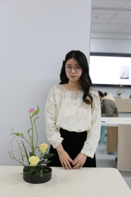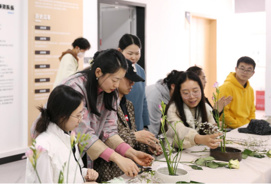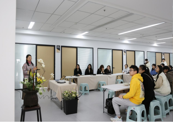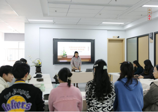 活动伊始,苏苏老师向同学们进行了插花艺术的理论讲解。她谈到,花文化是一个国家和民族文化的组成部分,是在浓厚的传统文化基础上发展起来的,因此花文化的形成与发展也必然随着国家和民族文化的兴衰而起落。在介绍中国传统插花文化时,她细梳秦汉至明清的插花艺术,就插花的历史起源、技术手法、程序排场、盘盆容器等方面进行了详细讲解,向同学们展示了中式插花艺术背后蕴含的理性意趣和人生哲理——中华民族视花为有灵之物,有情之物,赏花除了赏识它那静态的外部形态美之外,还应观察欣赏它动态的生命变化之趣。赏花不仅娱人感官,更撩人情思,能寄以心曲。