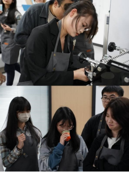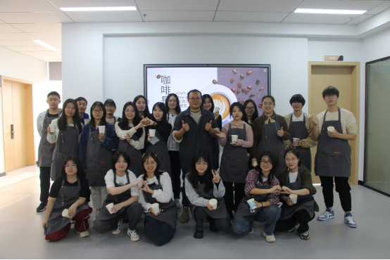 随后,在咖啡制作环节,为了让同学们切身体会咖啡的美感与咖啡制作的艺术内涵,詹老师详细讲解了半自动咖啡机的使用技巧,并亲自示范了拿铁、卡布奇诺等经典意式咖啡的制作过程。同学们在詹老师的指导下,烘焙、研磨、冲泡、拉花,亲手调制出一杯杯香醇可口的咖啡。
