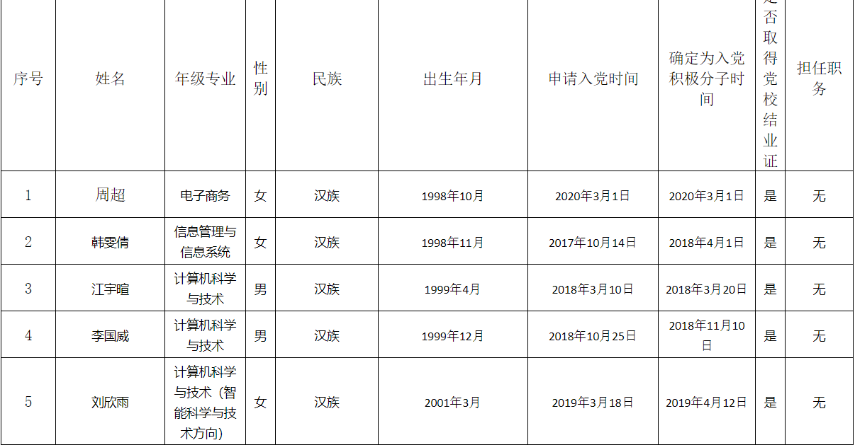 公示期满后将对发展对象进行政治审查,进一步考察培养。具体名单如下: