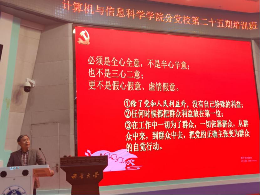 典礼结束后,思政理论课专家张国镛教授以“中国共产党的指导思想、性质、宗旨”为主题为学员们讲授了生动的第一课,为同学们指明了对党的正确态度:必须全心全意,不是半心半意、不是三心二意、更不是虚情假意。作为党的一员,任何时候都要把群众的利益放在第一位,一切为了群众,一切依靠群众,从群众中来,到群众中去。张国镛教授本期党课的分享使学员们受益匪浅,端正了自己的态度,明确了自己的目标,激发了学员们积极投身党的建设的热情。