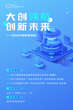 3月11日19:00,av在线 在团委青李空间报告厅举行以“大创领航,创新未来”为主题的大学生创新创业项目宣讲活动。活动由团委学生会学习科技部张天骋同学主持,实习辅导员马潇潇、2022级与2023级同学代表参加活动。学习科技部张天骋同学从项目简介、申报流程、项目风采和选题范围四个方面对大创进...