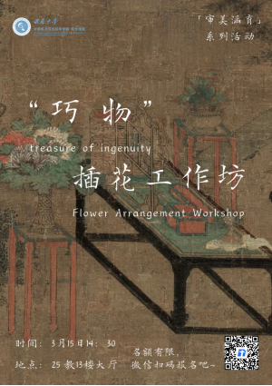 插花是一门艺术,一枝一束,一插一剪,塑造不同形态,传递不同情感。3月15日下午2点30分,“巧物·插花工作坊”在25教13楼大厅举行,特邀插花师苏苏担任主讲老师、团委书记杨靖欣以及各年级学生代表参加了本次活动。活动伊始,苏苏老师向同学们进行了插花艺术的理论讲解。她谈到,花文化是一个国家和民族文化的组成部分,...