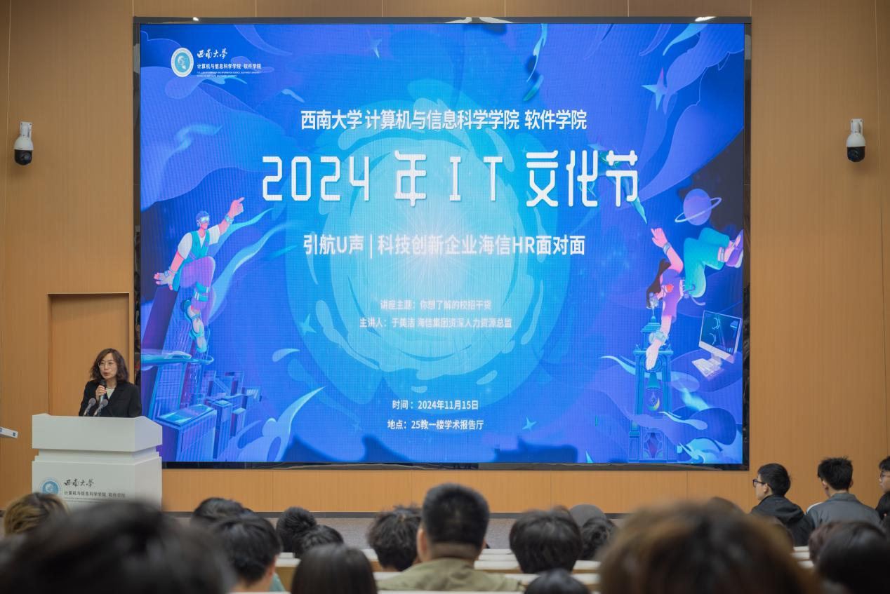 11月15日下午2点,av在线 2024年IT文化节正式启动,首场活动“引航U声|科技创新企业海信HR面对面”在25教1楼学术报告厅隆重举行。海信集团资深人力资源总监于美洁女士、av在线 党委副书记王晖、团委书记杨靖欣、辅导员唐瑞萱及av在线 200余名同学共同参与。活动由2021级辅导员夏浩然主持。图1:...